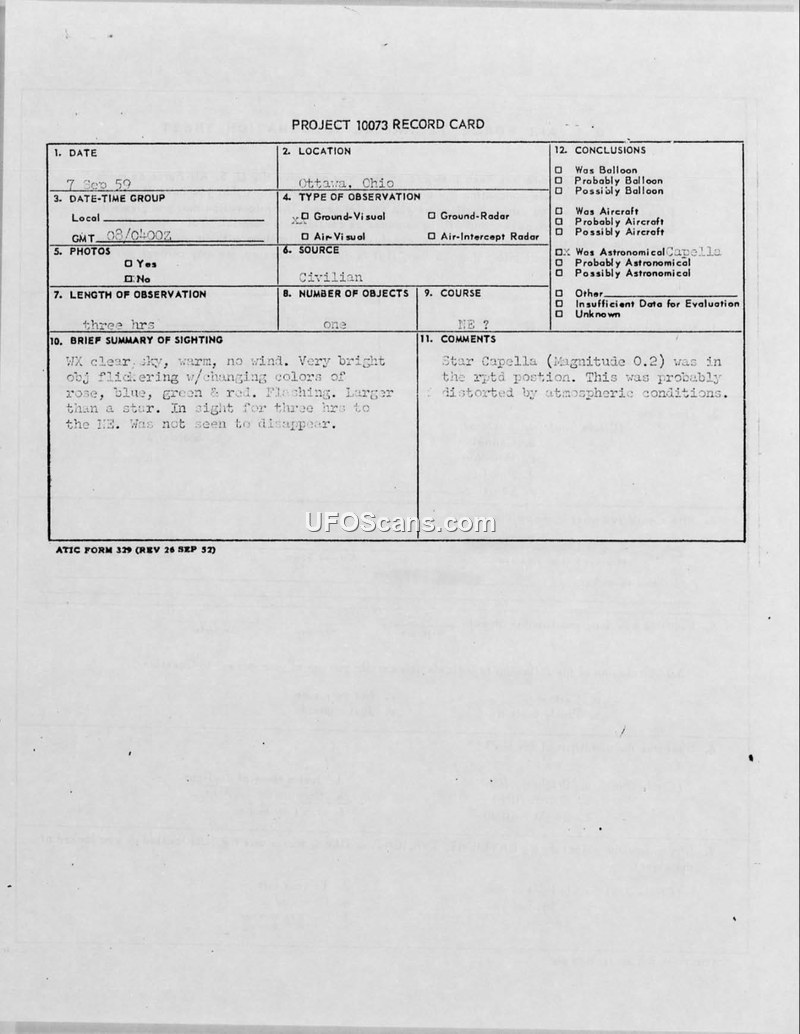 This document is a Project 10073 record card detailing a sighting reported in Ottawa, Ohio, on September 7, 1957. The witness, a housewife, reported observing a single, stationary object for approximately three hours. She described the object as being larger than a star and noted that it flickered and flashed in various colors, including rose, blue, green, and red. The witness reported the sighting to the Civil Defense Director of Putnam County, Ohio, who subsequently contacted the Air Technical Intelligence Center (ATIC). The witness also noted that a similar object had been sighted about a year prior, speculating it might be a planet. The official conclusion reached by the Air Force investigation was that the object was the star Capella (Magnitude 0.2), and its appearance was likely distorted by atmospheric conditions. The report includes a technical information sheet filled out by the witness, which confirms the weather was clear with no wind, and that the object was observed outdoors in a residential area. The witness indicated she did not see the object disappear. The documentation includes standard ATIC forms for recording such phenomena, including sketches and observational details.