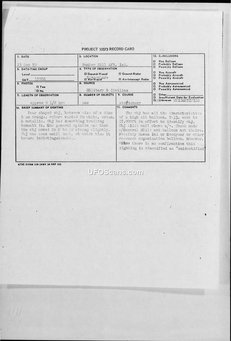 A long-duration UFO sighting occurred on September 13, 1959, near Bunker Hill AFB, involving multiple military and civilian witnesses. Despite an intercept attempt by a T-33 aircraft, the object remained at high altitude and was ultimately classified as an unidentified balloon.
