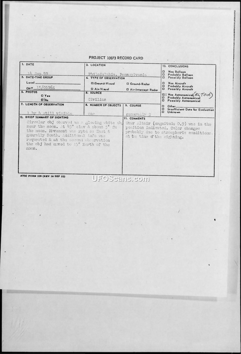 Project 10073 Record Card — Philadelphia, Pennsylvania, 14 September 1959