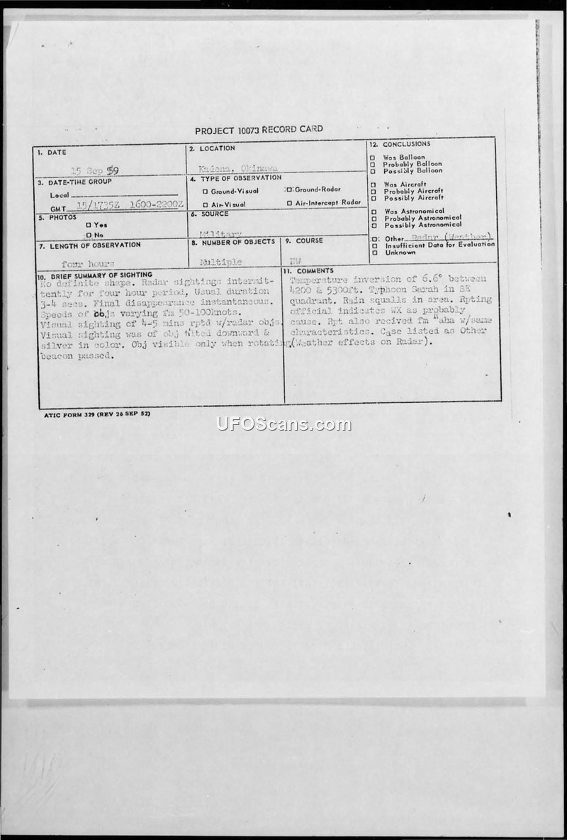 This document consists of a Project 10073 record card and a series of incoming military messages detailing a UFO sighting event at Kadena Air Base, Okinawa, on September 14, 1959. The incident occurred during a period of severe weather associated with Typhoon Sarah. Between 1600Z and 2200Z, multiple radar contacts were observed on the AN/CPN-18 search radar, and a single visual sighting was reported by three Air Force personnel on duty at the Kadena Approach Control Facility. The visual object was described as an elongated, silver-colored strip of material, appearing similar to a piece of window or chaff, and was only visible when illuminated by the rotating beacon of the air base tower. The object appeared to move in a straight path away from the observers at a relatively slow speed, consistent with the prevailing surface winds. Radar operators noted that the contacts appeared brighter than standard T-33 aircraft returns and were egg-shaped or oblong. The report includes detailed weather data, noting a temperature inversion between 4200 and 5300 feet and the presence of Typhoon Sarah in the vicinity. After an official inquiry, it was confirmed that no military aircraft were airborne in the area at the time, as all had been evacuated or grounded due to the typhoon. The investigating officer, Captain C. A. Barchiesi, concluded that the visual sighting was likely a piece of debris, such as chaff, and that the radar contacts were likely caused by the temperature inversion and poor weather conditions prevalent in the area. The report emphasizes that no physical evidence was available and that the observers, while serious, could not provide a definitive identification of the objects.