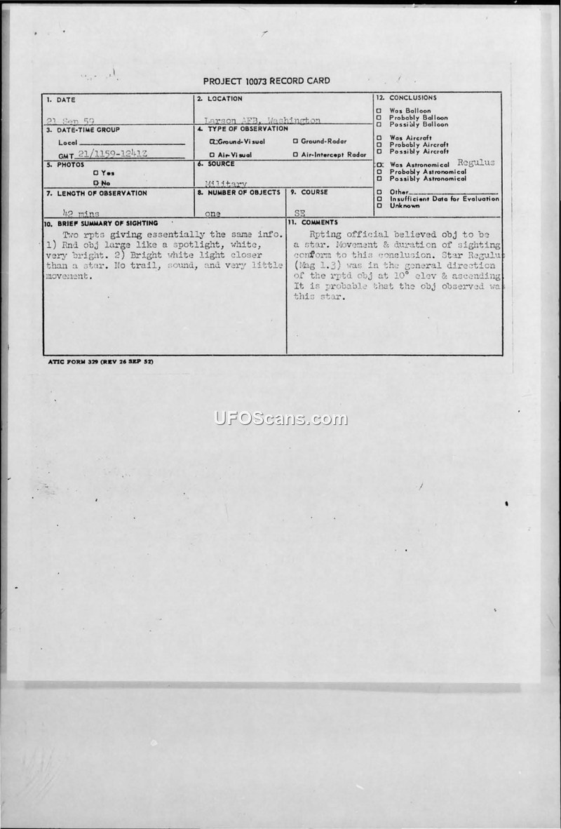 This document consists of a Project 10073 record card and associated military teletype messages regarding an unidentified aerial phenomenon reported on September 21, 1959, near Larson Air Force Base in Washington. The sighting, which lasted approximately 42 minutes, involved a single, round, bright white object described by witnesses as resembling a spotlight. Ten observers, including control tower personnel, reported the object. Witnesses noted that the object appeared to be a very bright star, brighter than any other star they had seen, and appeared closer to the earth than a star. The object was observed at an elevation of approximately 10 degrees and was reported to have very little movement, though it was noted as moving in a south-easterly direction. The object was visible in clear skies until cloud cover moved in between the observers and the object. Radar contact was also reported, with an aircraft tracking the object at 12,000 feet east of Larson AFB. The official conclusion reached by the reporting officials was that the object was the star Regulus (magnitude 1.3). This conclusion was supported by the movement and duration of the sighting, which were consistent with the position of the star at the time. Capt. G. L. Van Buskirk, a flight service clearance officer at Hamilton AFB, concurred with the assessment that the object was an unusually bright star.
