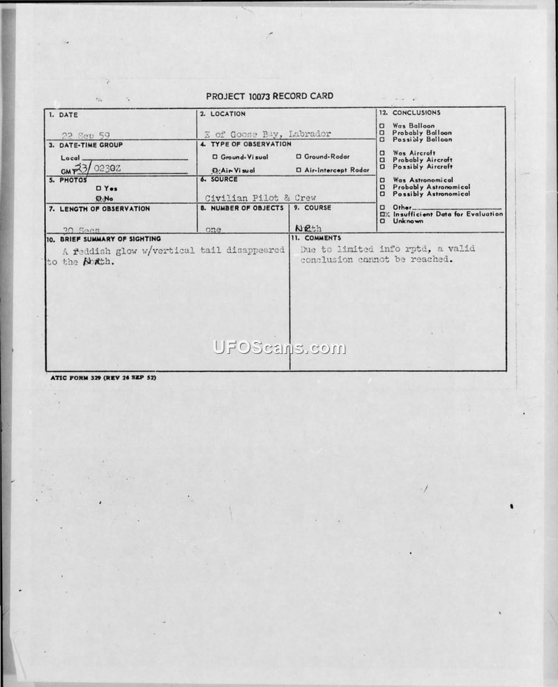 A Pan American flight crew reported a luminous object with a vertical tail over Labrador on September 22, 1959. The Air Force concluded there was insufficient data to reach a definitive explanation.