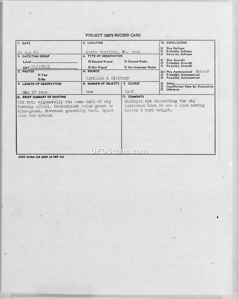 On September 24, 1959, multiple observers in North Carolina and Virginia reported a bright green, cigar-shaped object with a tail. The Air Force investigated the incident under Project 10073 and concluded it was a large meteor.