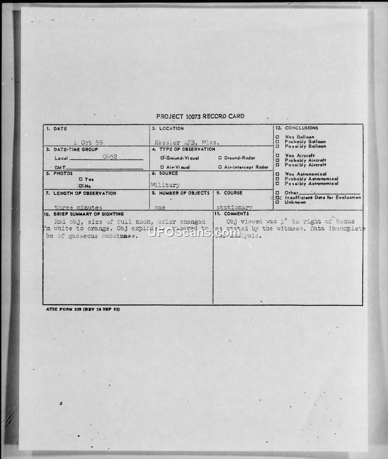 The object was observed at 0452 hours on 1 October 1959 by personnel at Keesler AFB. The witness described a round object, the size of the full moon, which changed from white to orange and appeared to explode. The object was noted to be 5 degrees to the right of Venus. The official assessment concluded that the data provided was insufficient for evaluation.