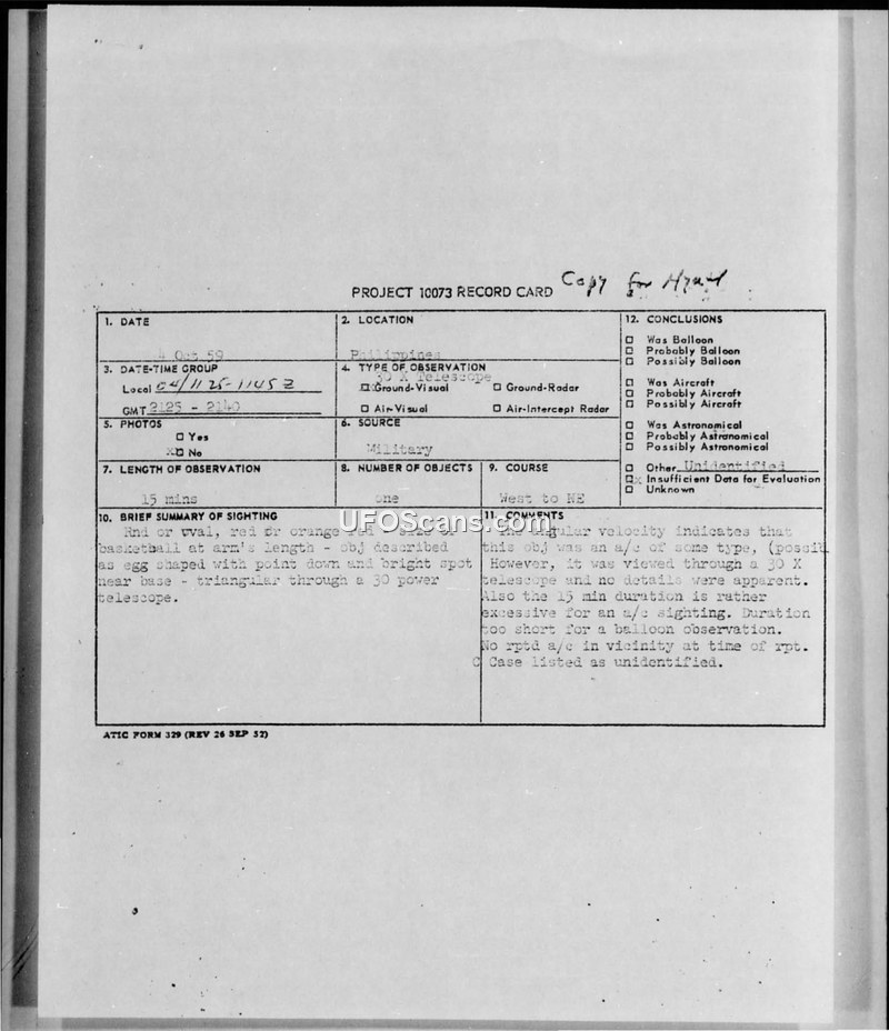 A 1959 report from the Philippines detailing a 15-minute sighting of an unidentified red/orange object by two US Navy personnel. The object's appearance changed when viewed through a telescope, and official investigators found no satisfactory explanation for the event.