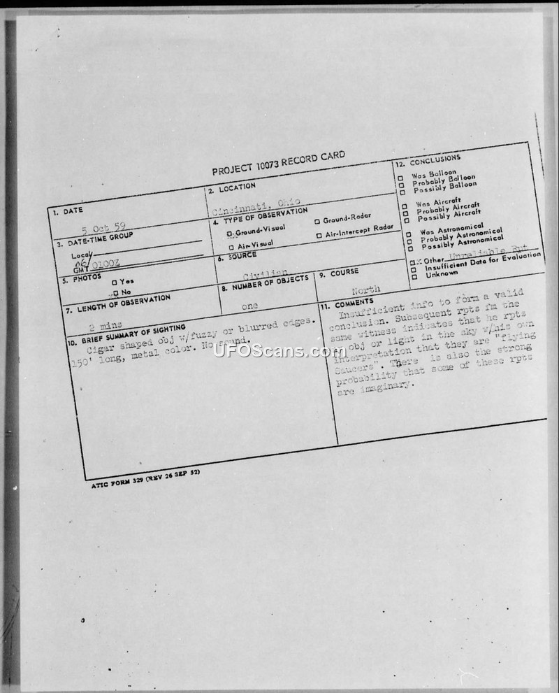 Project 10073 Record Card — Cincinnati, Ohio, 5 October 1959