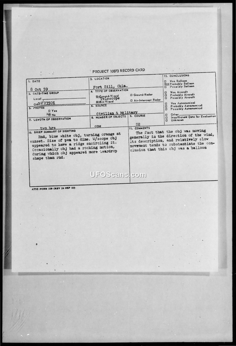 A sighting of a round, blue-white object over Fort Sill, Oklahoma, on October 8, 1959, was investigated by the Air Force. The object was officially identified as likely being a large experimental balloon.