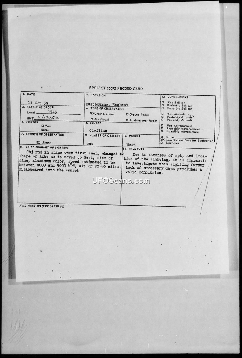 Project 10073 Record Card — Eastbourne, England, 11 Oct 59