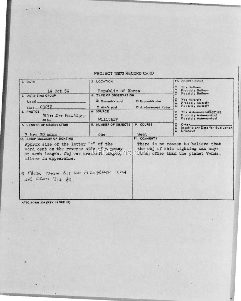 Project 10073 Record Card — Republic of Korea, 19 October 1959