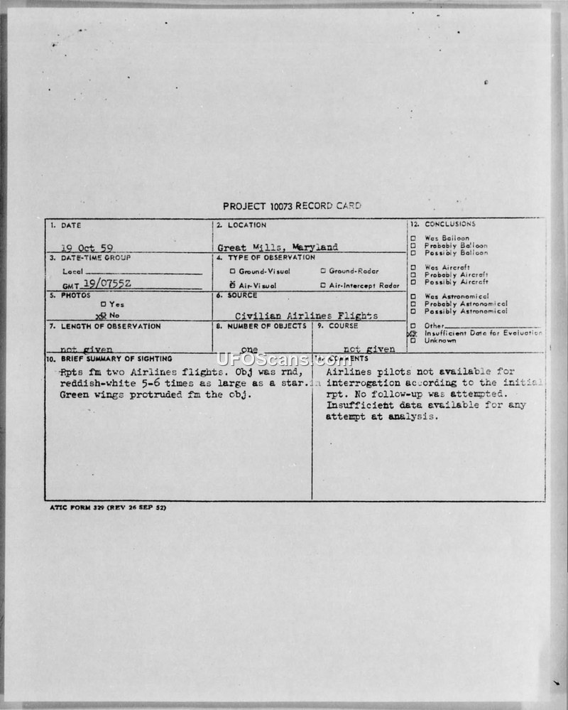 Project 10073 Record Card — Great Mills, Maryland, 19 Oct 59