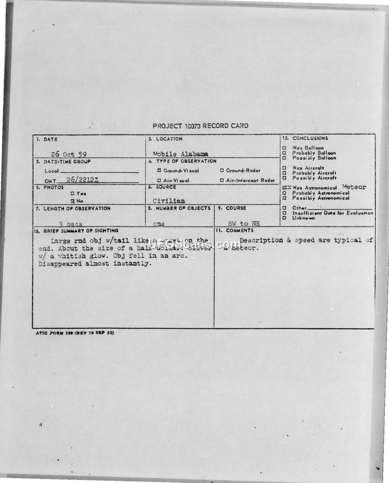 A civilian in Mobile, Alabama, reported a comet-like object on October 26, 1959. The Air Force concluded the sighting was an astronomical meteor.