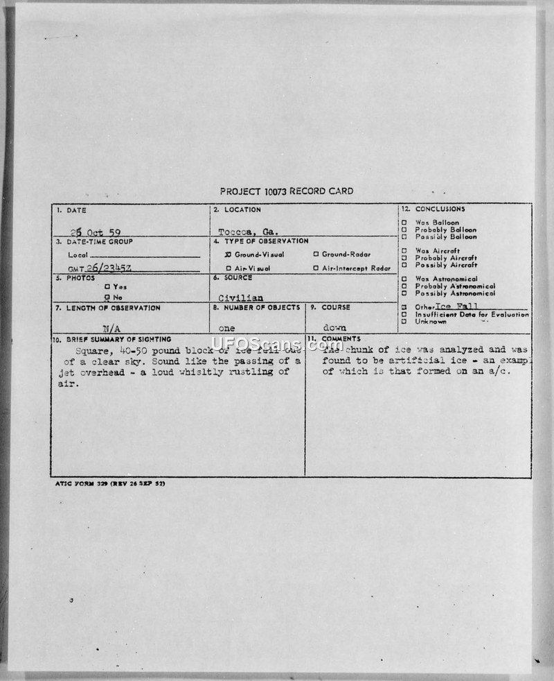 This document collection details the investigation into an incident on October 26, 1959, near Toccoa, Georgia, where a 40-50 pound square block of ice fell from a clear sky onto the farm of O. J. Lecroy. The event caused significant public interest and concern, with initial reports suggesting the ice might be radioactive after a local witness attempted to test it using photographic film. The Air Force, through the 63rd Troop Carrier Wing at Donaldson Air Force Base, initiated an investigation under Project 10073. The Air Technical Intelligence Center (ATIC) coordinated with various agencies, including the Smithsonian Institute, the U.S. Geological Survey, and the National Bureau of Standards, to determine the origin of the ice. Early confusion regarding potential radioactivity was quickly dismissed by subsequent testing, including the use of a Geiger counter. The investigation concluded that the ice was not of natural origin but was instead 'artificial ice' formed by water leaking from a commercial DC-8 jet aircraft flying at high altitude. The water froze on the exterior of the aircraft and detached during the plane's descent. The final report, released in June 1960 by Representative James Davis, confirmed this finding, noting that the investigation involved a massive amount of study by three government agencies and resulted in a 40-page report. The incident serves as a documented example of the military's process for evaluating anomalous aerial phenomena that were ultimately attributed to aviation-related mechanical issues.