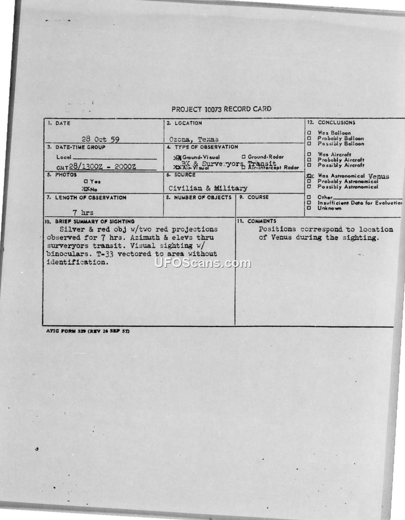 The object was observed for seven hours near Ozona, Texas, by multiple witnesses using binoculars and a surveyor's transit. The object's position was noted to correspond to the location of Venus during the sighting, though the final report from the 732D ACWRON suggests characteristics resembling a balloon.