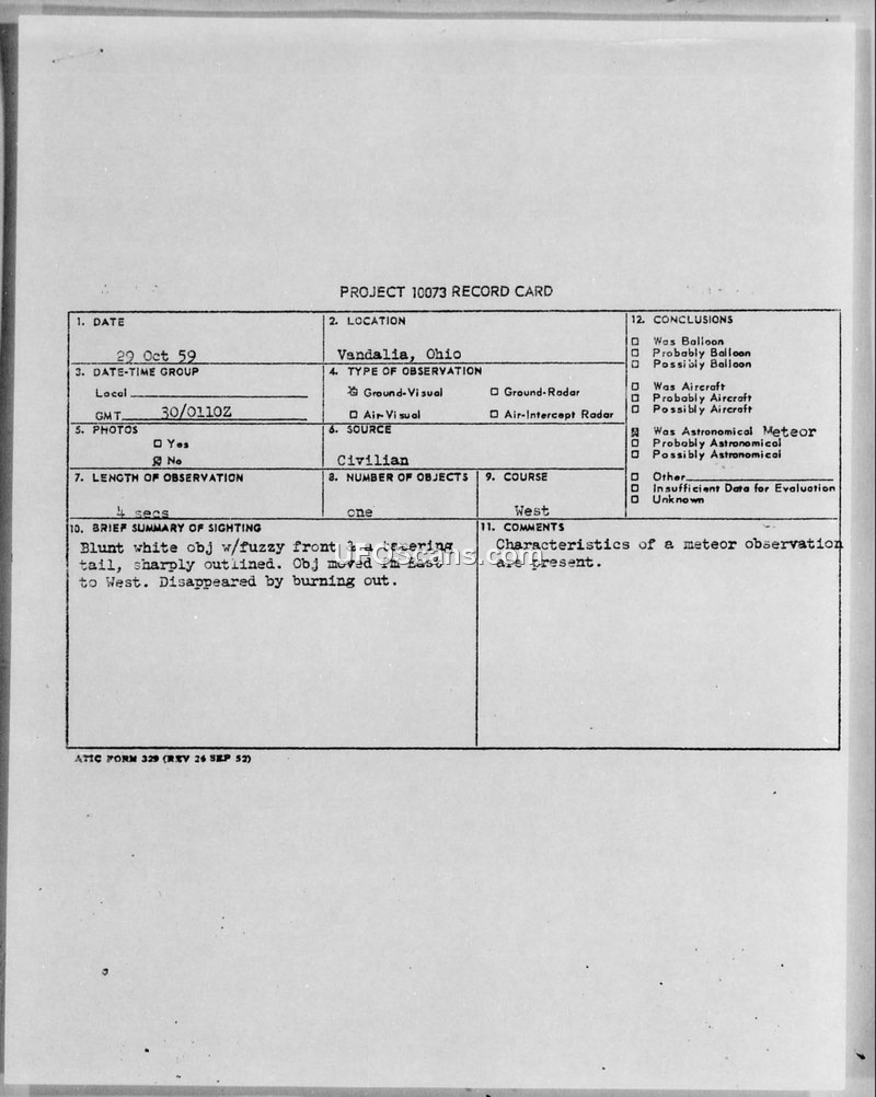 A USAF witness reported a sighting of a bright object in Vandalia, Ohio, on October 29, 1959. The object was officially classified as an astronomical meteor.