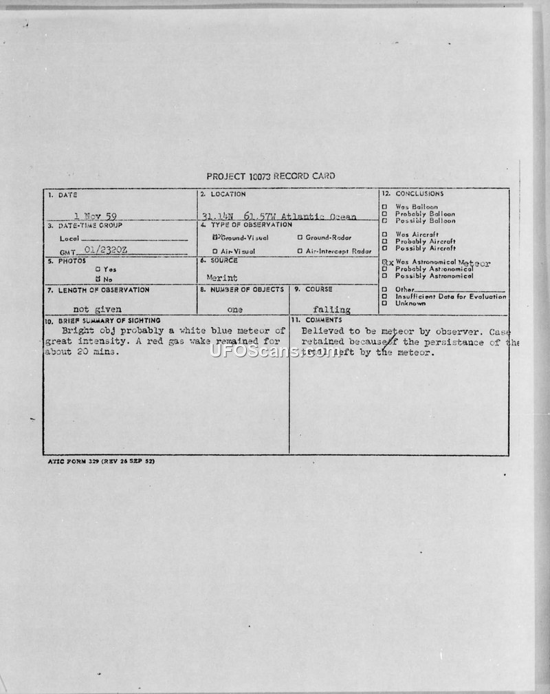 Project 10073 Record Card — Atlantic Ocean Sighting, 1 November 1959