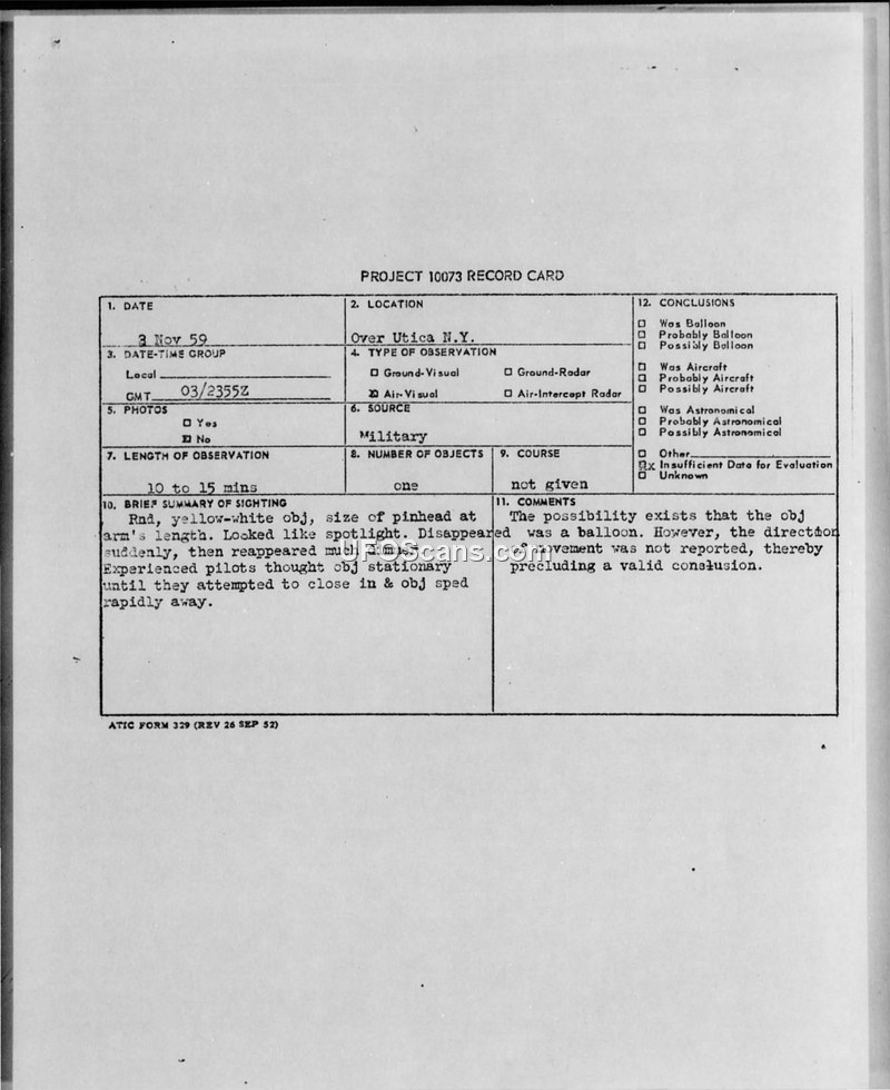 Project 10073 Record Card — Utica, N.Y., 3 Nov 59
