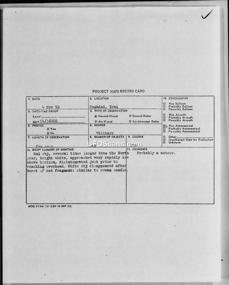 A US Air Attaché in Baghdad reported a bright, fast-moving object that disintegrated into red fragments on November 4, 1959. The event was officially classified as a probable meteor.