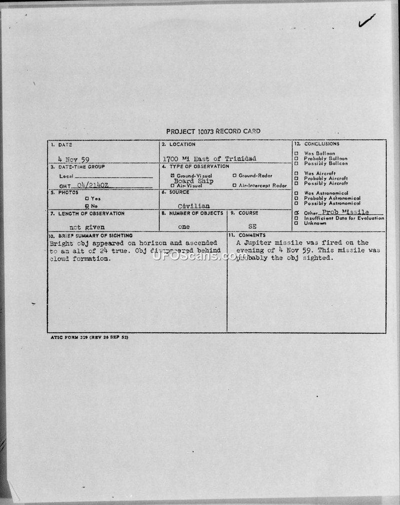 Project 10073 Record Card — 4 Nov 59 Sighting, East of Trinidad