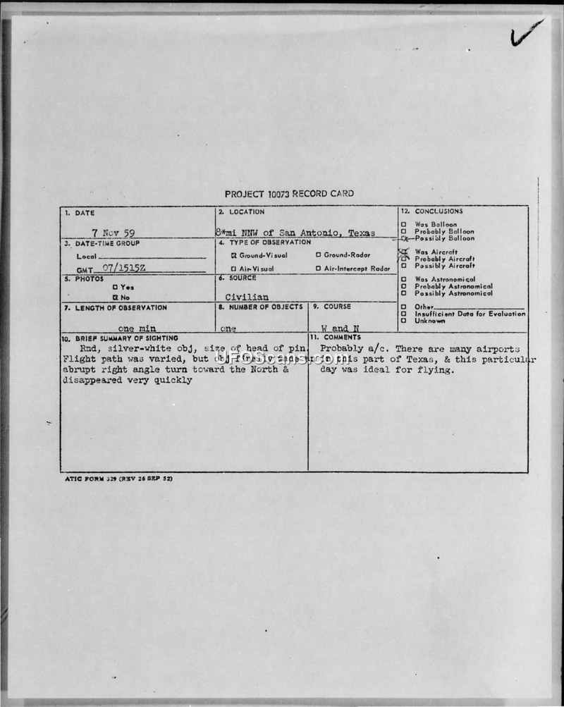 Project 10073 Record Card — 7 Nov 59 Sighting, 8mi NNW of San Antonio, Texas