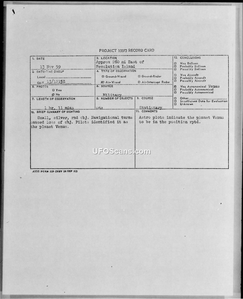 A B-52 crew reported a silver, round UFO on 13 November 1959 near Labrador. The object was officially identified as the planet Venus after astronomical plotting.