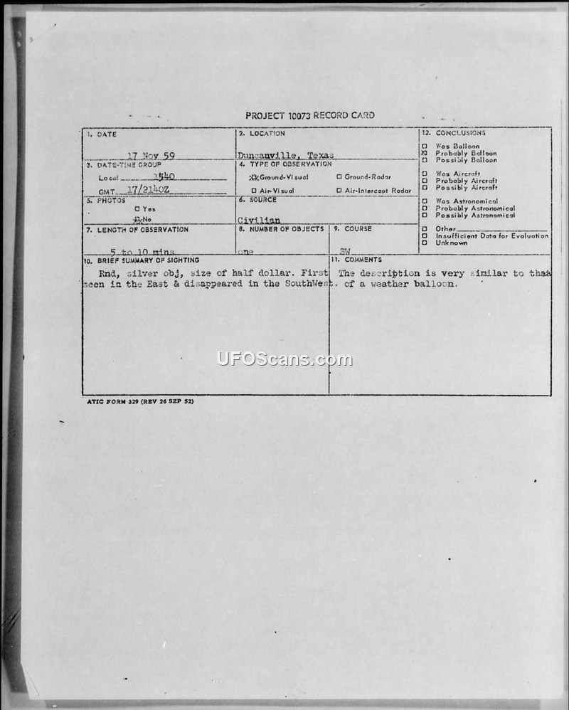 Project 10073 Record Card — Sighting in Duncanville, Texas, November 17, 1959