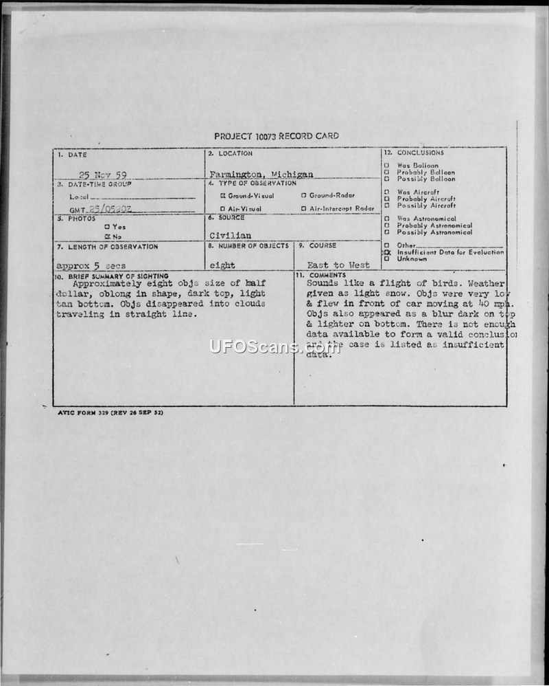 A civilian reported eight low-flying, oblong objects in Farmington, Michigan, on November 25, 1959. Military investigators concluded there was insufficient data to identify the objects, suggesting they might have been a light reflection or birds.