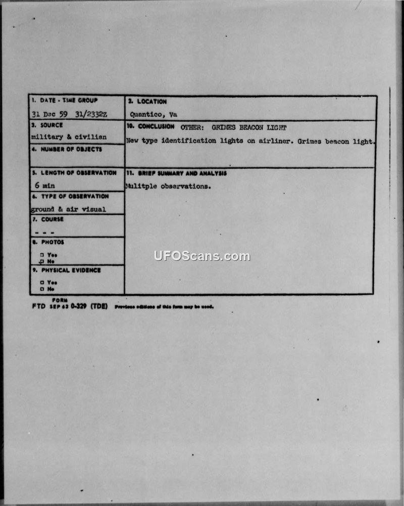 Military personnel at Quantico reported UAP sightings in late 1953 and early 1954. An investigation by ATIC identified the objects as commercial airliners equipped with new Grimes Beacon anti-collision lights.