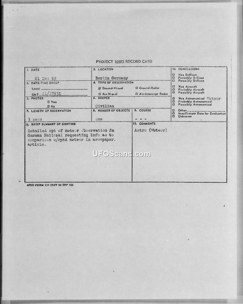 This document collection contains a Project 10073 record card and subsequent correspondence regarding a sighting reported by a German national in Berlin on December 21, 1959. The witness, a psychotherapist, wrote to the United States military office of defense in Washington, D.C., describing a celestial body she observed at approximately 18:53 or 18:54 hours. She reported seeing a radiant white ball with a diameter of 0.12 to 0.15 meters, accompanied by a flaring red comet-like tail, moving at great velocity between the constellations of Taurus and Eridanus before disappearing near Aries. The observation lasted approximately three seconds. The witness had previously read a newspaper report about a similar celestial body and sought to compare her experience with official records. The Air Technical Intelligence Center (ATIC) investigated the report and determined that their files contained no record of a UFO sighting on that date. In a memorandum dated March 23, 1960, Colonel Philip G. Evans of the ATIC informed Major Tacker of the Public Information Division that the description provided by the witness was consistent with a meteor. This conclusion was formally communicated to the witness in a letter dated March 25, 1960, signed by Major Lawrence J. Tacker, which stated that the Air Force could not correlate her sighting with any other reports and that the object was likely a meteor.
