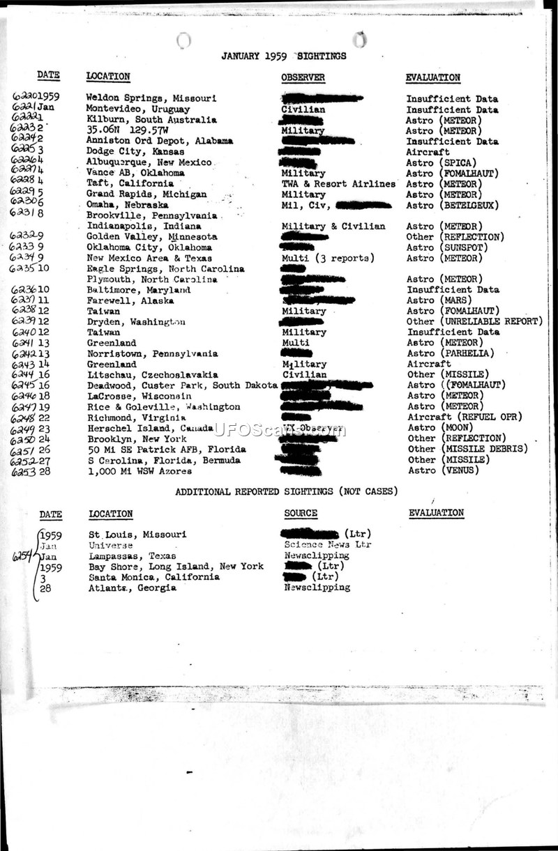 The document provides a monthly chronological list of UFO/UAP sightings reported throughout 1959, including location, observer type, and a brief evaluation for each case. Many cases are categorized as 'Astro' (meteor, planet, star), 'Aircraft', 'Balloon', or 'Insufficient Data'.