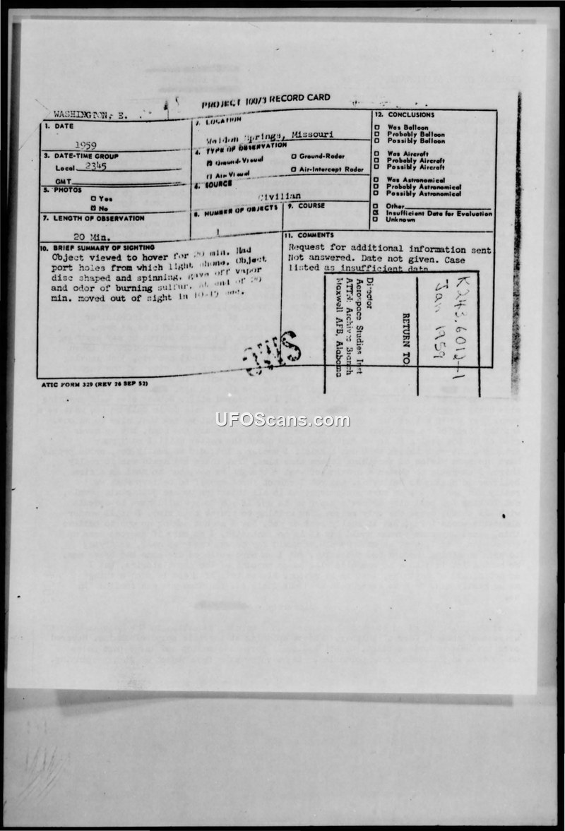 This document consists of a Project 10073 record card and subsequent correspondence regarding a UFO sighting that occurred in 1959 near Weldon Springs, Missouri. The primary report describes an incident involving three witnesses who observed a disc-shaped object hovering over the Weldon Springs Plant. According to the witness account, the object was spinning, featured port holes emitting light, and left a vapor trail as it departed in a southwest direction. The witnesses reported an odor of burning sulfur and a burning sensation in their noses during the observation, which lasted approximately 20 minutes. The witnesses, who were traveling in a car at the time, initially kept the sighting quiet due to fear of ridicule. In 1962, the United States Air Force, specifically Lt. Col. R. Friend, contacted the witness to request further information, noting that the original report lacked sufficient detail to reach a conclusion. The Air Force provided questionnaires for the witnesses to complete independently to facilitate a more thorough investigation. The document includes a hand-drawn sketch by the witness illustrating the object's appearance, including the port holes and its position relative to the plant and the highway. The case was ultimately categorized as having insufficient data for evaluation.