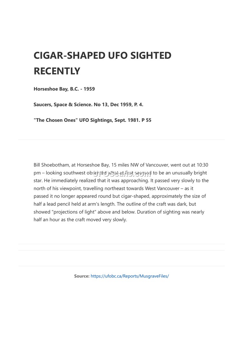 This document reports a 1959 sighting of a slow-moving, cigar-shaped object with light projections by witness Bill Shoebotham in Horseshoe Bay, British Columbia. The report details the object's movement and appearance over a duration of nearly thirty minutes.