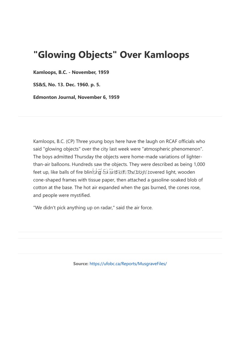 In November 1959, a series of sightings of 'glowing objects' occurred over Kamloops, British Columbia. The Royal Canadian Air Force (RCAF) initially characterized these sightings as an 'atmospheric phenomenon' and confirmed that they had not detected any objects on radar. However, the mystery was resolved when three local boys admitted that the objects were, in fact, homemade devices. These devices were constructed using light, wooden cone-shaped frames covered in tissue paper, with a gasoline-soaked blob of cotton attached to the base. When the cotton was ignited, the resulting hot air caused the cones to rise, creating the appearance of blinking balls of fire in the sky. The incident, which was witnessed by hundreds of people, was reported in the Edmonton Journal on November 6, 1959, and later documented in SS&S, No. 13 in December 1960.