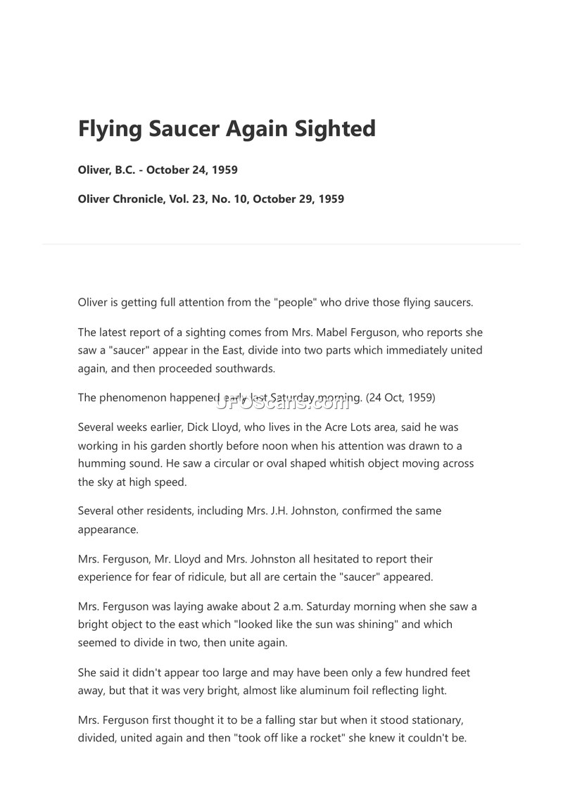 A 1959 newspaper report details multiple sightings of unidentified aerial objects in Oliver, B.C., including a specific account by Mrs. Mabel Ferguson of an object that divided and reunited. Witnesses reported the phenomena involved bright lights, high speeds, and humming sounds.