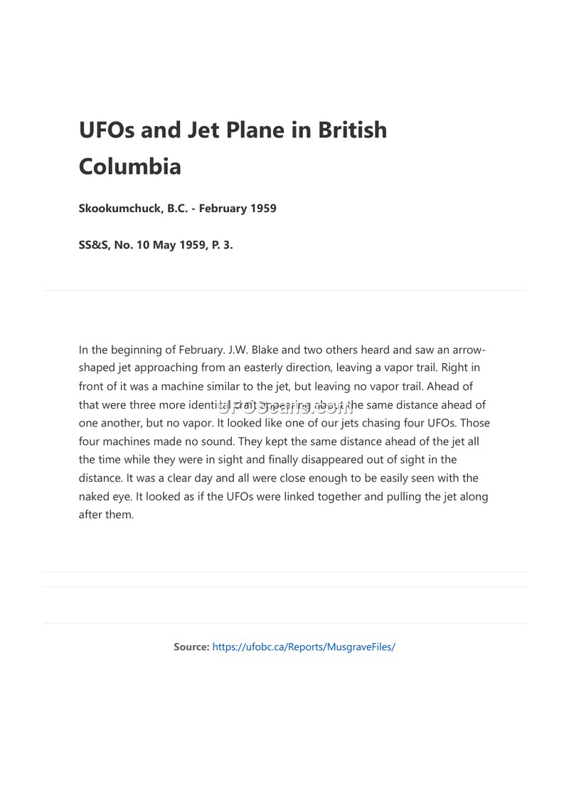 In early February 1959, near Skookumchuck, British Columbia, J.W. Blake and two other witnesses observed an aerial event involving a jet aircraft and four unidentified objects. The witnesses heard and saw an arrow-shaped jet approaching from the east, which was leaving a visible vapor trail. Positioned in front of the jet was a machine similar in appearance to the jet, but which produced no vapor trail. Ahead of that machine were three additional identical craft, spaced at equal distances from one another, also without vapor trails. The witnesses noted that the four unidentified machines made no sound. Throughout the duration of the sighting, the four objects maintained a constant distance ahead of the jet. The witnesses observed the group on a clear day and were close enough to see the objects with the naked eye. The report notes that the objects appeared to be linked together and seemed to be pulling the jet along behind them before they eventually disappeared into the distance.