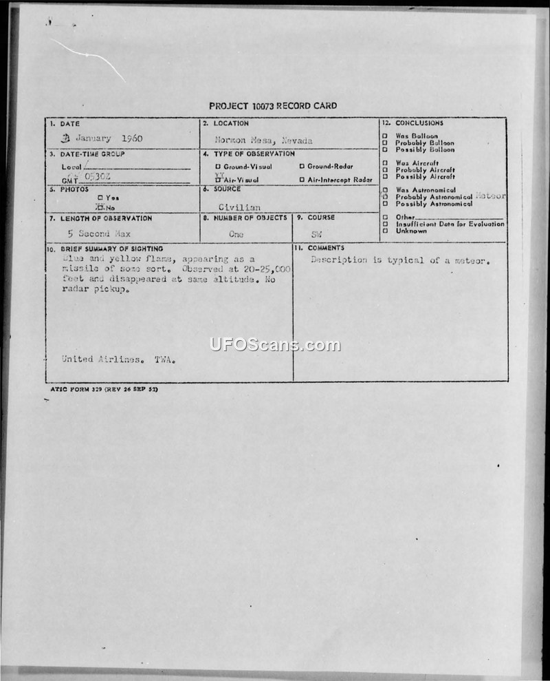 A 1960 sighting of a 'missile-like' object with a blue and yellow flame by a United Airlines flight crew was investigated by the Air Technical Intelligence Center. The event was officially concluded to be a meteor after consultation with the Lick Observatory.