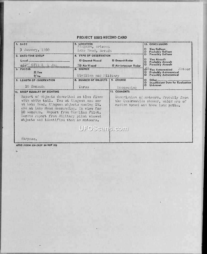 This document details a sighting report from January 3, 1960, involving three objects observed over Kingman, Arizona, and Lake Mead, Nevada. The report, filed under Project 10073, describes the objects as having a blue flame with a white tail, moving in a southwest direction and descending. The primary witness, 2LT V. L. Harpman of the 193rd Fighter Interceptor Squadron, Boise Air National Guard, observed the objects while flying at an altitude of 32,000 feet. His report was corroborated by other accounts, including a civilian pilot and a tower employee named Jack McMillen at McCarran Field, Las Vegas, who described the objects as the fastest thing he had ever seen. Despite the initial reports of a UFO, the official conclusion reached by the Air Technical Intelligence Center (ATIC) was that the objects were meteors, likely associated with the Quadrantids meteor shower, which are known for their medium speed and long paths. The documentation includes multiple operational messages and a record card summarizing the event, noting that the pilot himself identified the objects as meteors. The sighting was also reported to Hamilton Air Force Base, where it was processed as a UFO report before being formally evaluated as astronomical in nature.