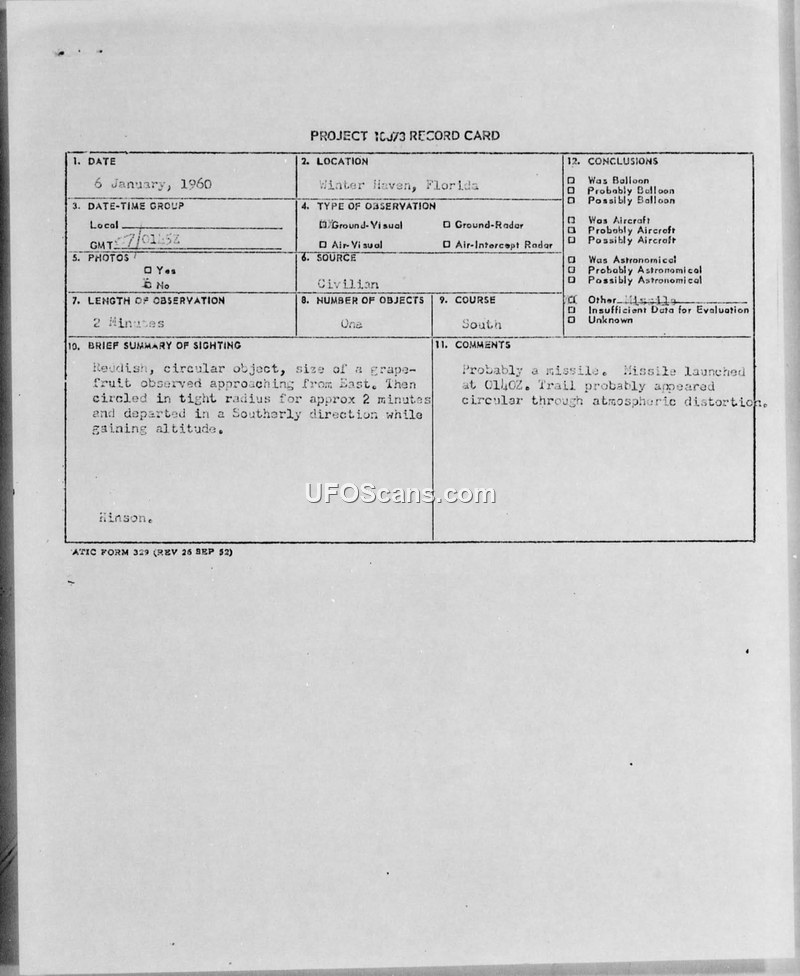 A civilian in Winter Haven, Florida, reported a circular, reddish object on January 7, 1960. The military investigation concluded the sighting was an Atlas ICBM launch from Cape Canaveral.