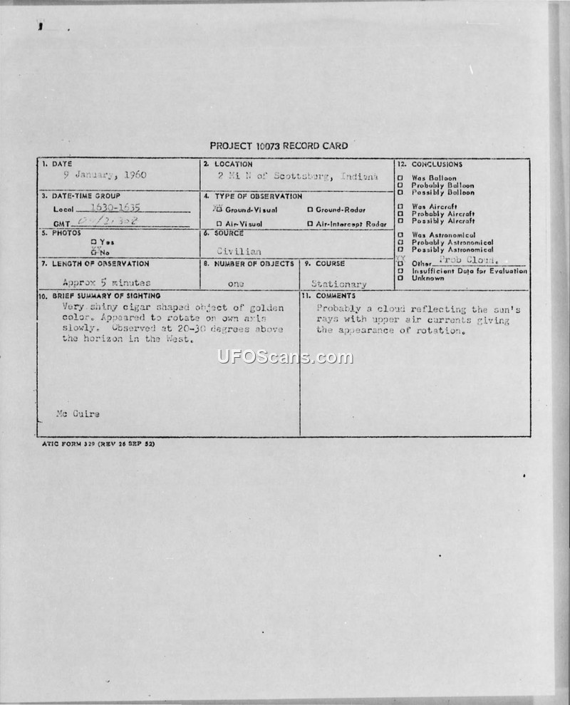 Project 10073 Record Card — 9 January 1960, Underwood, Indiana