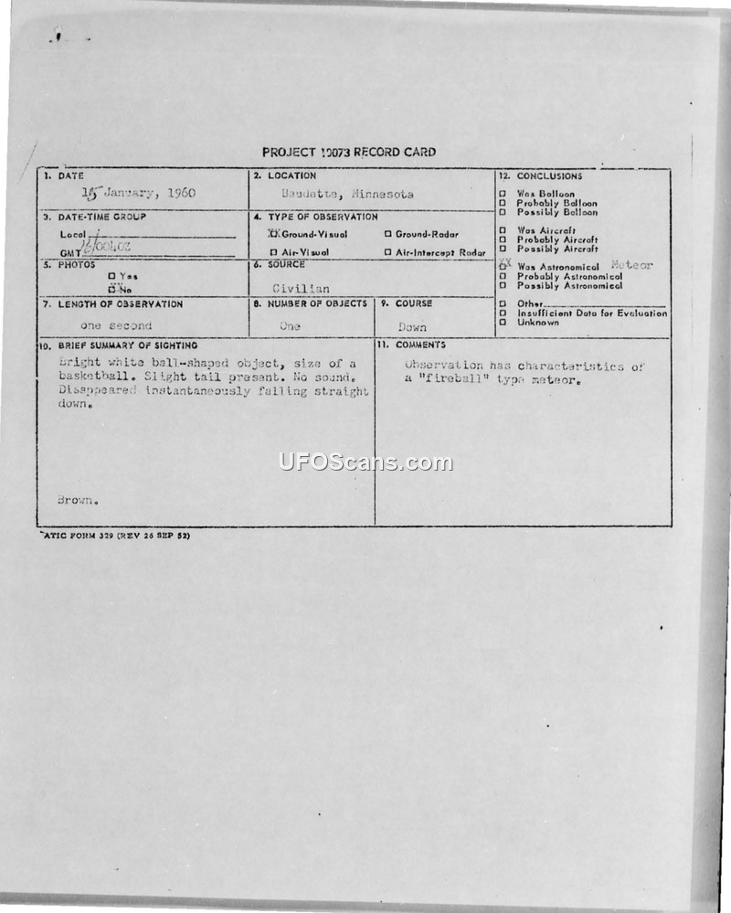 A civilian witness reported a bright, ball-shaped object falling straight down near Baudette, Minnesota, on January 16, 1960. Military intelligence evaluated the report and concluded the object was likely a fireball-type meteor.