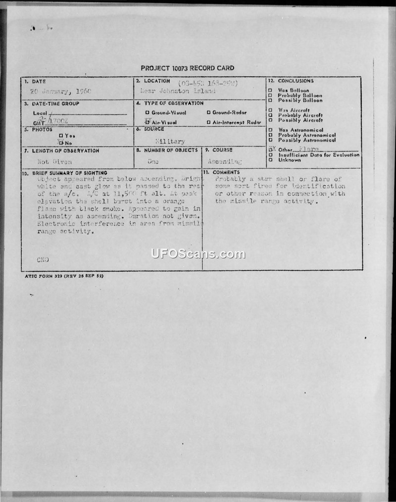 A 1960 sighting near Johnston Island involving a bright, ascending object observed by a flight crew and tracked by radar. The event was officially attributed to military flare or star shell activity related to missile range operations.