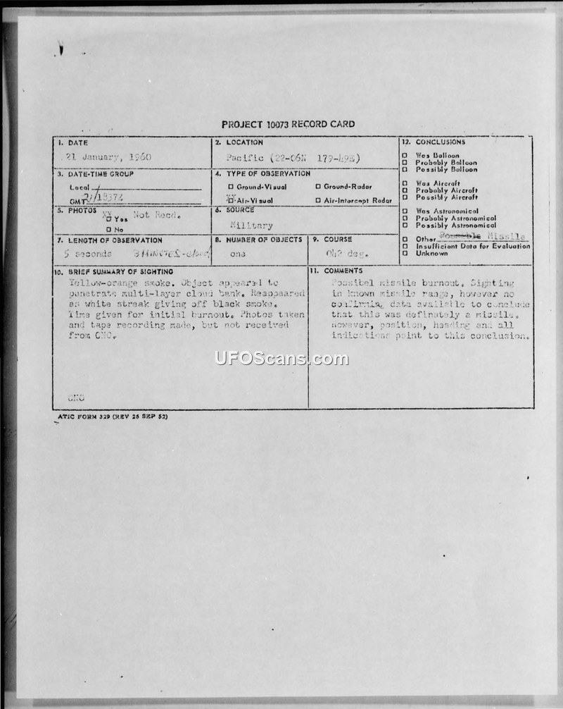 This document consists of a Project 10073 record card and subsequent military correspondence regarding an aerial sighting on 21 January 1960. At 1357Z, in the Pacific at coordinates 22-06N 179-49E, an unidentified object was observed by crew members of a military aircraft. The witness, an AD2 stationed in the tail turret, observed the object for approximately five seconds. The object was described as emitting yellow-orange smoke and appearing as a white streak as it penetrated a multi-layer cloud bank at a 30-degree angle to the horizon. Upon entering the overcast, the object disappeared, and a black cloud subsequently rose to an altitude of approximately 6,000 to 7,000 feet. The pilot and copilot also observed this black cloud. The sighting was recorded on an ICS tape, and photographs were taken of the event. The official assessment, as noted on the record card, suggests the phenomenon was a possible missile burnout, given the location was within a known missile range. However, the report explicitly states that there was no confirmation and that the available data was insufficient to definitively conclude it was a missile, despite all indications pointing toward that conclusion. The correspondence between ATIC and the Chief of Naval Operations (CNO) tracks the status of the evidence, specifically the tape and photographs, which were requested for further evaluation. The final status of the evidence indicates that the operational summary and tapes were forwarded by DIRNSA on 25 March 1960, while the photographs were to be forwarded by the CNO upon completion of processing. The document was later declassified under AFR 205-1, paragraph 2-17a, on 2 January 1968.