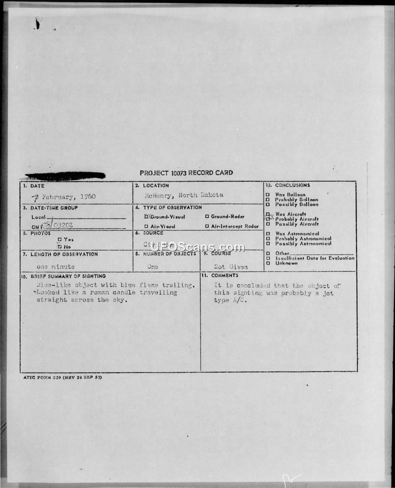 A sighting of a blue, flame-trailing object near McHenry, North Dakota, on February 7, 1960, was investigated by the Air Technical Intelligence Center. The official conclusion determined the object was likely a jet aircraft using an afterburner.