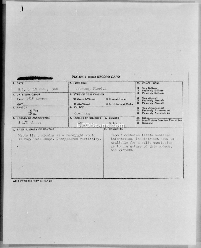 A civilian in Sebring, Florida, reported an unidentified oval light in February 1960. The Air Force determined the report provided insufficient data for a valid conclusion.