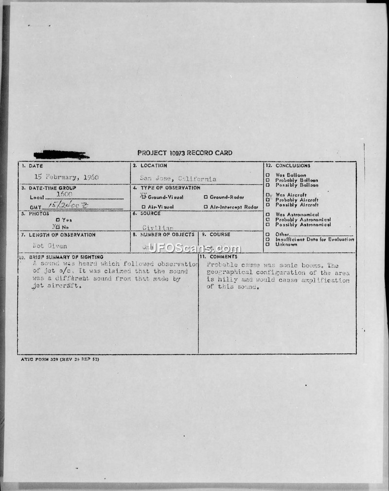 This document collection centers on a 1960 correspondence between Mrs. Grace Mosley of San Jose, California, and the U.S. Air Force regarding unidentified aerial phenomena. Mrs. Mosley reported hearing a distinct, non-jet sound following the passage of two jets on February 15, 1960, which she associated with a strange object she claimed to have observed in the hills. She also reported a 1955 sighting of a bright object moving like a pendulum in the same area. Mrs. Mosley further claimed that the 1960 event caused her to experience a physical reaction, specifically hives and a sensation of heat, leading her to seek medical attention. The Air Force, through the Air Technical Intelligence Center (ATIC), investigated the report. Their conclusion was that the sounds heard in 1960 were sonic booms amplified by the hilly geography of the San Jose area. Regarding the 1955 sighting, the Air Force suggested it was likely caused by light reflected from the dome of the Lick Observatory, a theory supported by Dr. Donald H. Menzel of Harvard. The internal military correspondence reveals a dismissive attitude toward the witness; ATIC officials characterized Mrs. Mosley as 'highly excitable' and prone to 'preconceived notions.' They further suggested that her physical illness was psychosomatic in nature. The file includes a Project 10073 record card, a referral notice between military intelligence offices, and a copy of a local newspaper clipping regarding sonic booms in the valley, which the military used to support their explanation. The documents demonstrate the standard procedure for handling civilian UFO reports during this period, involving internal routing, expert consultation, and a formal, often skeptical, response to the witness.