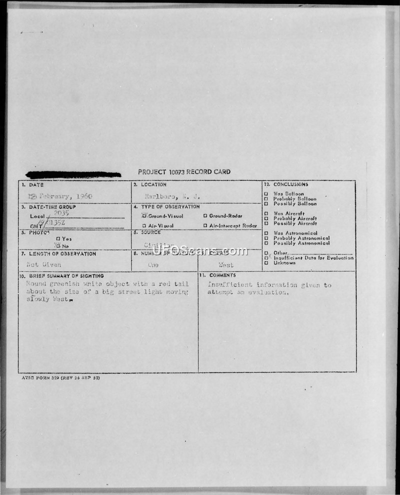 Project 10073 Record Card — Marlboro, N.J., 19 February 1960