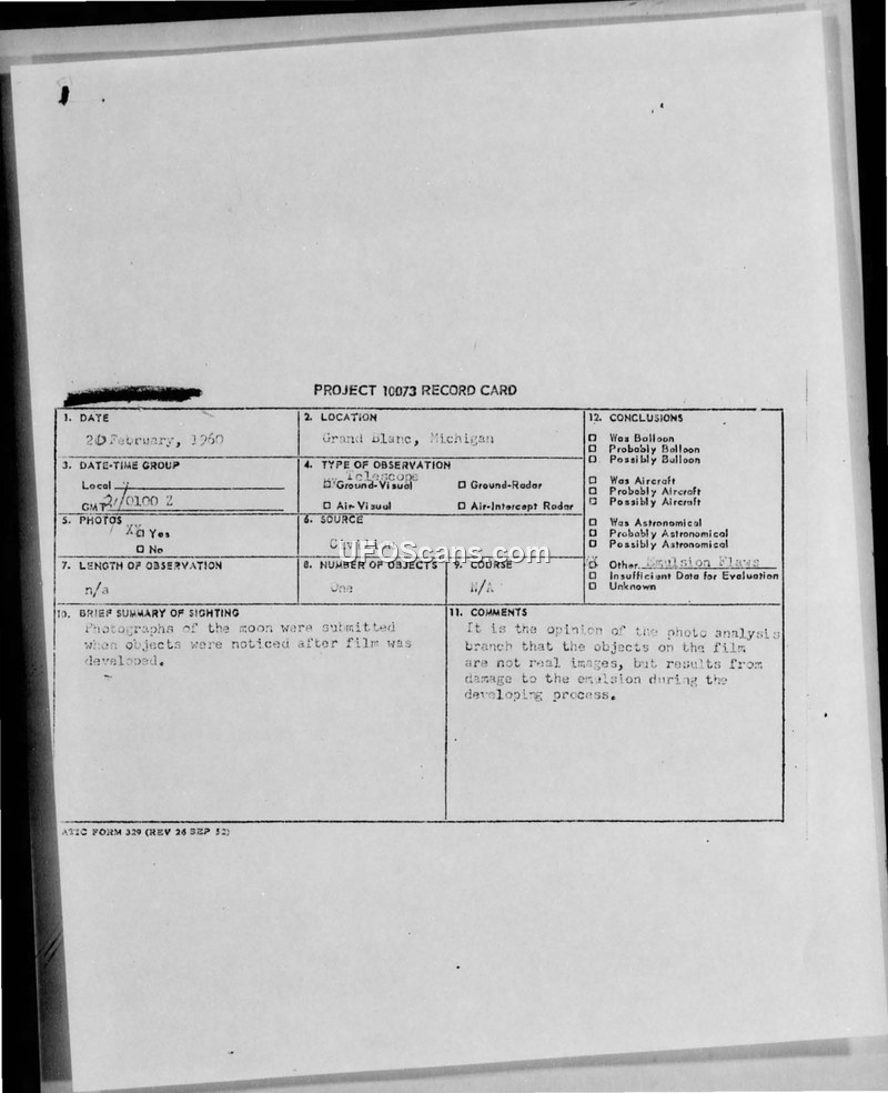 Project 10073 Record Card — Grand Blanc, Michigan, 20 February 1960