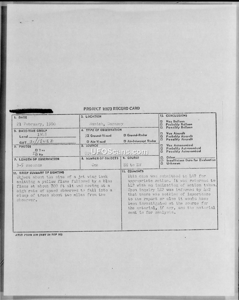 Project 10073 Record Card — Munich, Germany, 21 February 1960