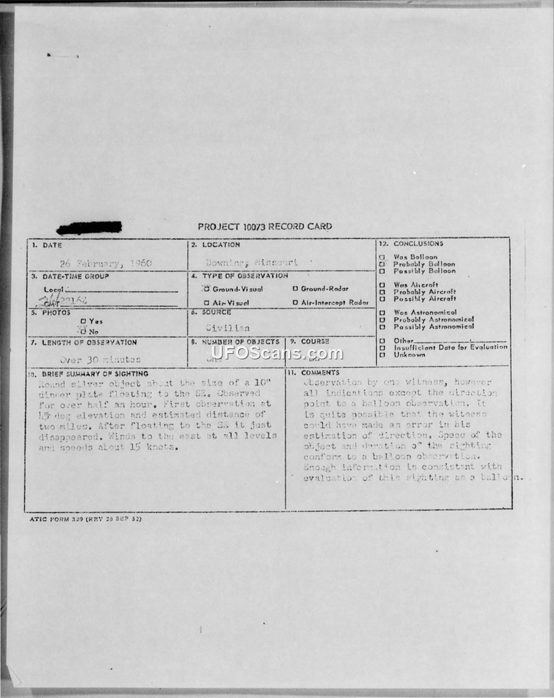 Project 10073 Record Card and UFO Follow-up Report — Downing, Missouri, 26 January 1960