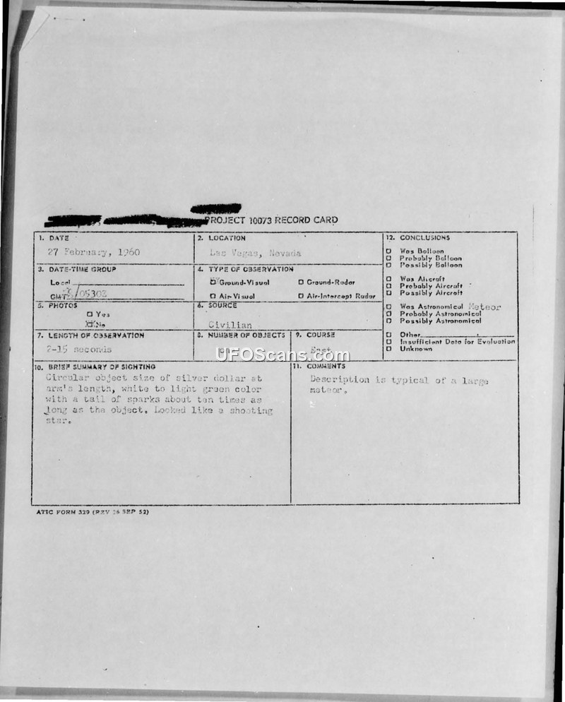 A 1960 sighting report from Las Vegas describes a bright, spark-trailing object observed by multiple witnesses. Military investigators concluded the object was likely a large meteor.
