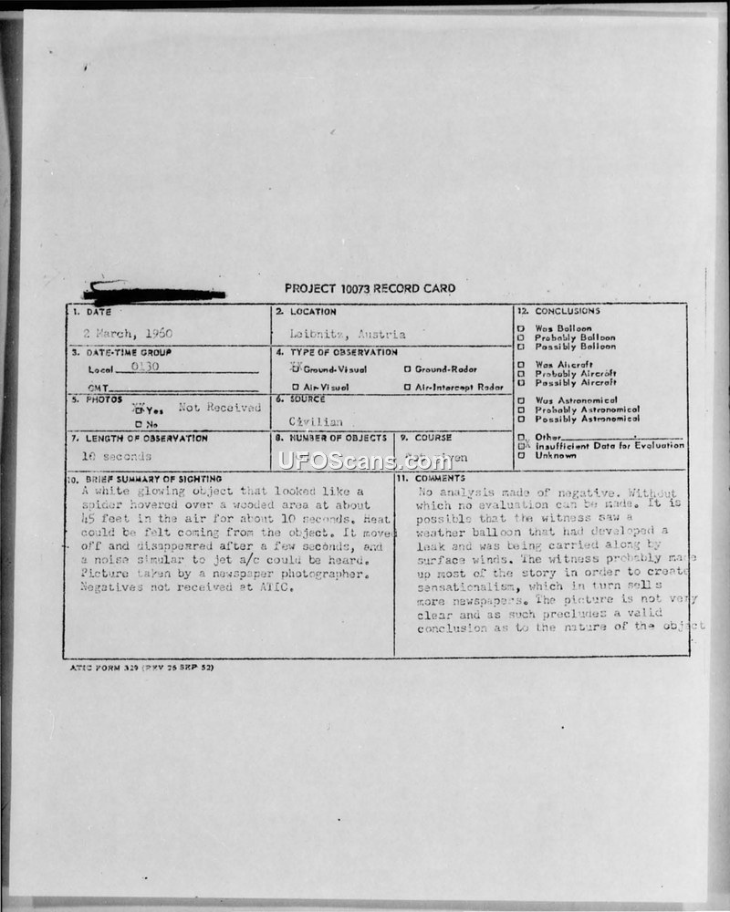 A newspaper photographer in Austria claimed to have photographed a glowing, spider-shaped object on March 2, 1950. ATIC officials were skeptical, citing a lack of evidence and potential fabrication for media sensationalism.